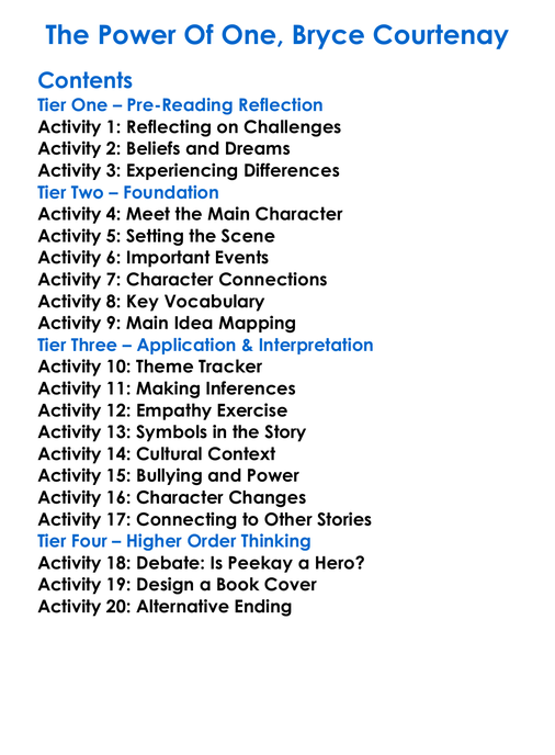 The Power Of One Bryce Courtenay Worksheet Activity Booklet