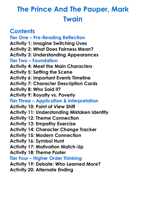 The Prince And The Pauper Mark Twain Worksheet Activity Booklet