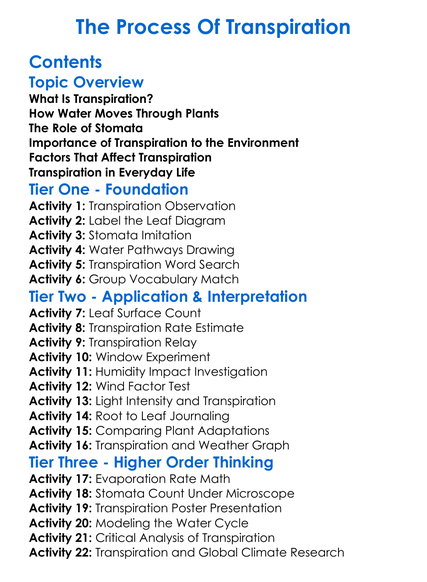 The Process Of Transpiration Worksheet Activity Booklet