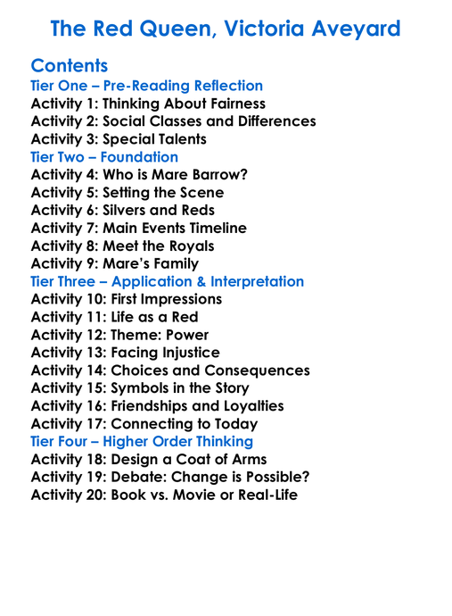 The Red Queen Victoria Aveyard Worksheet Activity Booklet