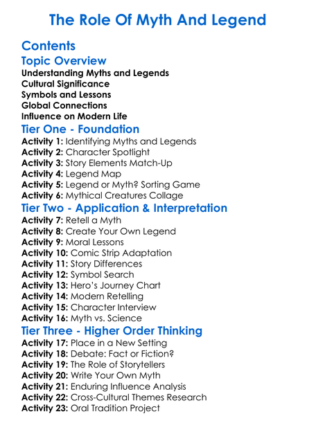 The Role Of Myth And Legend Worksheet Activity Booklet