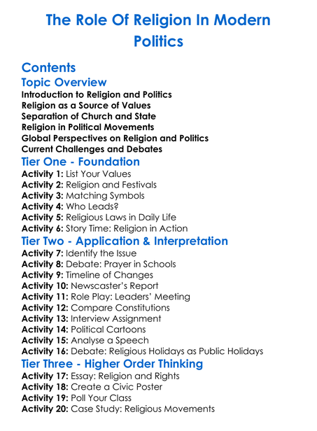 The Role Of Religion In Modern Politics Worksheet Activity Booklet