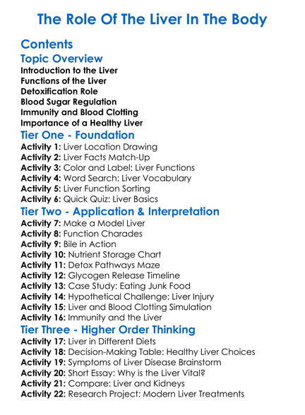 The Role Of The Liver In The Body Worksheet Activity Booklet