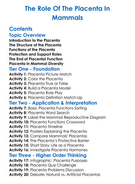 The Role Of The Placenta In Mammals Worksheet Activity Booklet