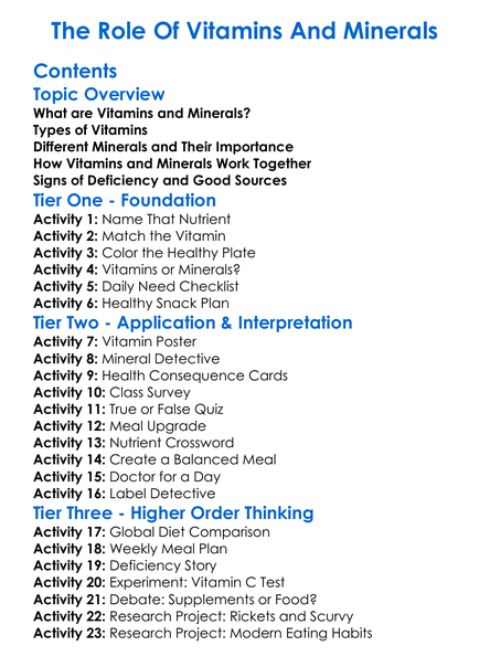 The Role Of Vitamins And Minerals Worksheet Activity Booklet