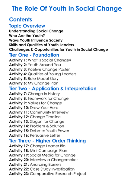 The Role Of Youth In Social Change Worksheet Activity Booklet