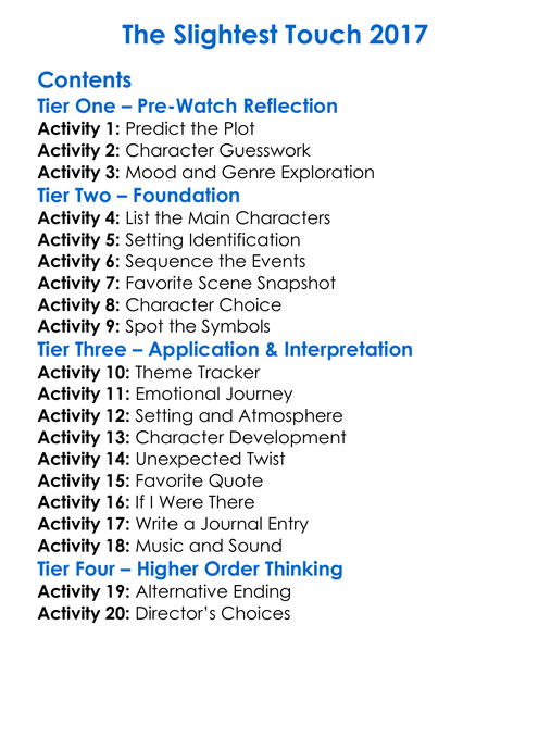 The Slightest Touch 2017 Worksheet Activity Booklet