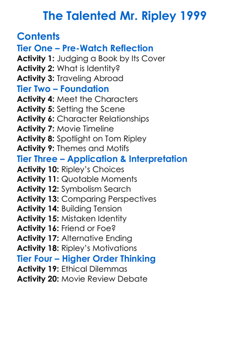 The Talented Mr Ripley 1999 Worksheet Activity Booklet
