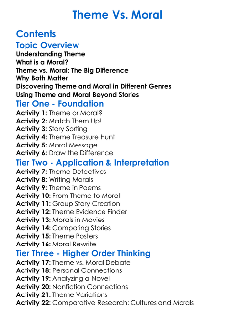 Theme Vs Moral Worksheet Activity Booklet
