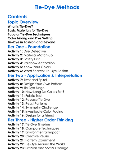 Tie-Dye Methods Worksheet Activity Booklet