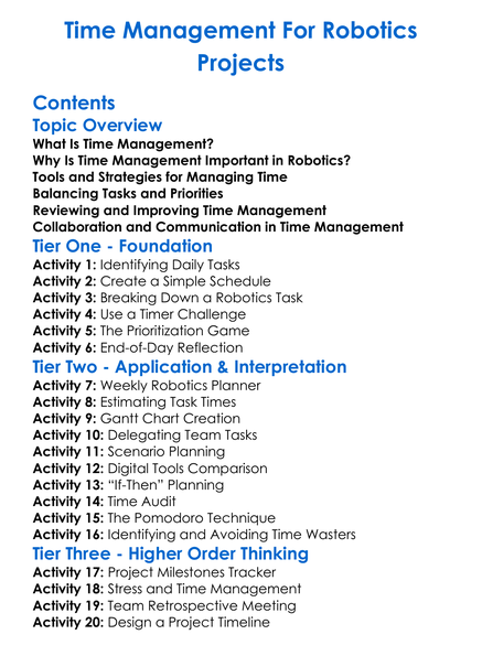 Time Management For Robotics Projects Worksheet Activity Booklet