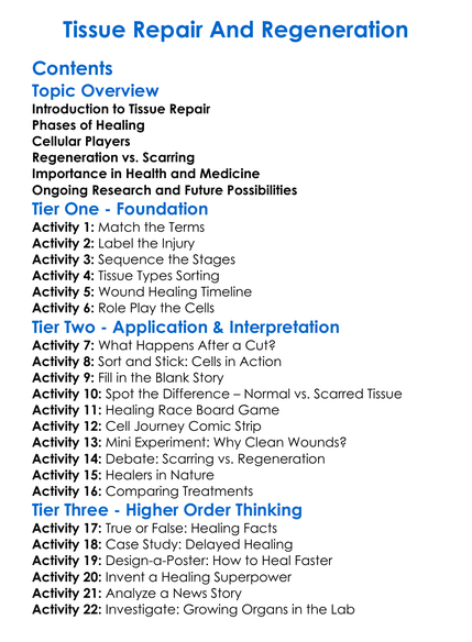 Tissue Repair And Regeneration Worksheet Activity Booklet