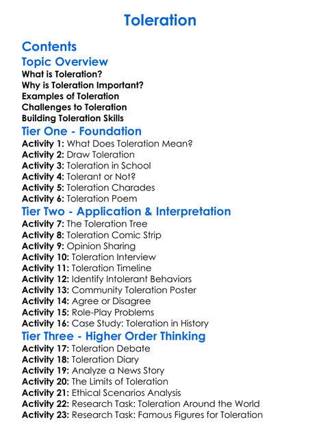 Toleration Worksheet Activity Booklet