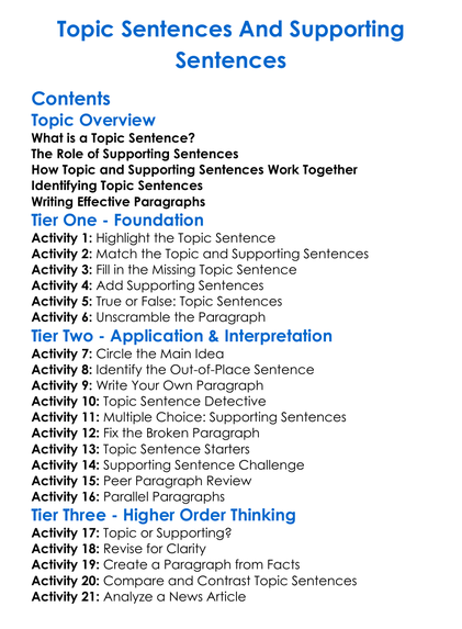 Topic Sentences And Supporting Sentences Worksheet Activity Booklet