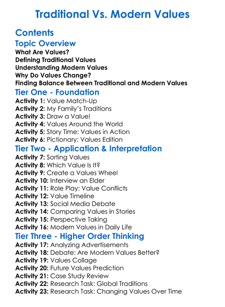 Traditional Vs Modern Values Worksheet Activity Booklet