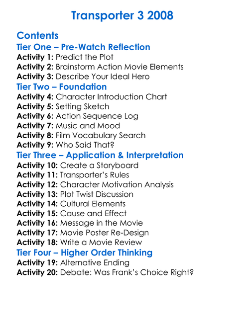Transporter 3 2008 Worksheet Activity Booklet