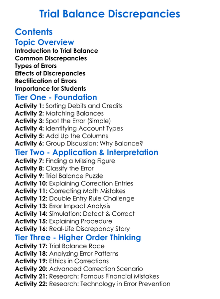 Trial Balance Discrepancies Worksheet Activity Booklet