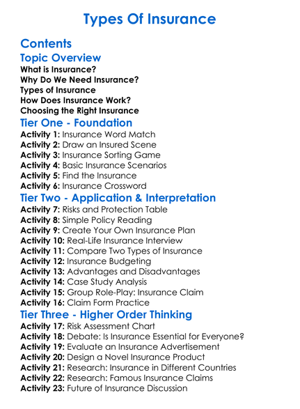 Types Of Insurance Worksheet Activity Booklet