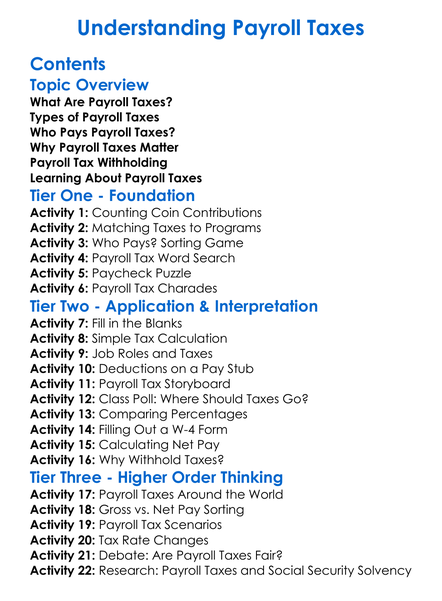 Understanding Payroll Taxes Worksheet Activity Booklet