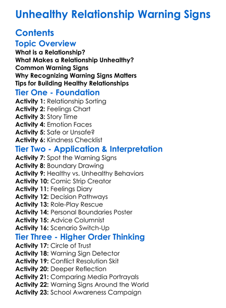 Unhealthy Relationship Warning Signs Worksheet Activity Booklet