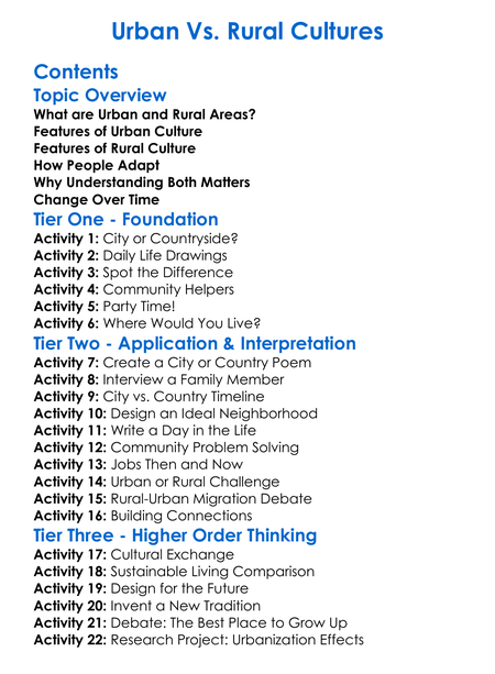 Urban Vs Rural Cultures Worksheet Activity Booklet