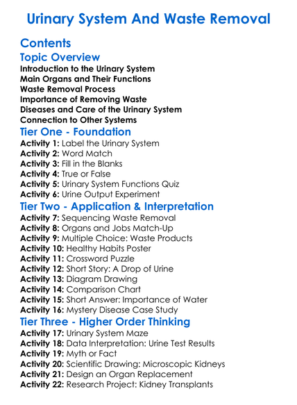 Urinary System And Waste Removal Worksheet Activity Booklet