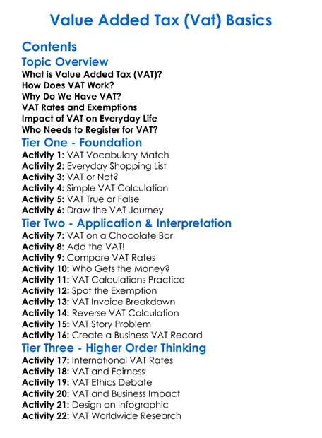 Value Added Tax Vat Basics Worksheet Activity Booklet
