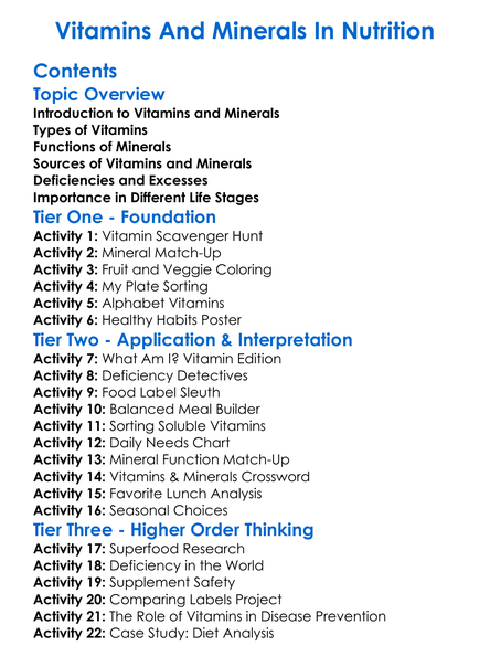 Vitamins And Minerals In Nutrition Worksheet Activity Booklet