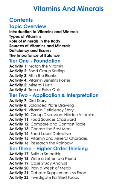 Vitamins And Minerals Worksheet Activity Booklet
