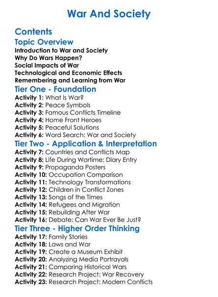 War And Society Worksheet Activity Booklet
