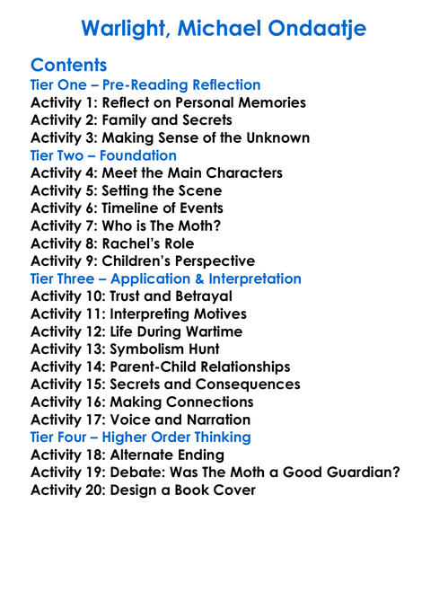 Warlight Michael Ondaatje Worksheet Activity Booklet