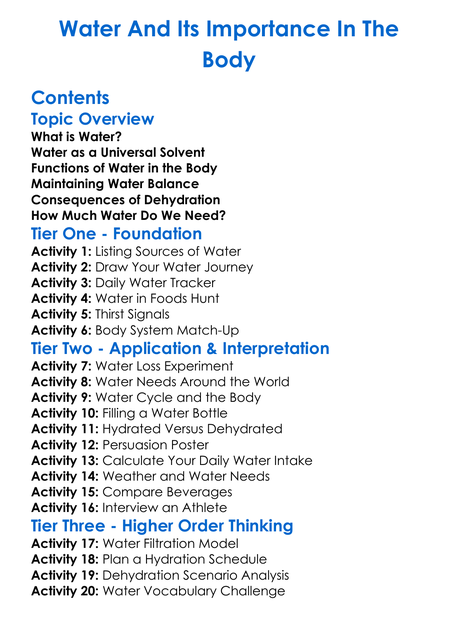 Water And Its Importance In The Body Worksheet Activity Booklet