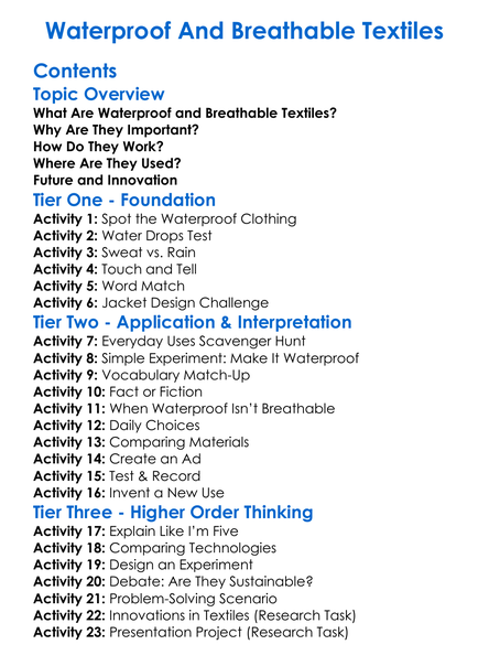 Waterproof And Breathable Textiles Worksheet Activity Booklet