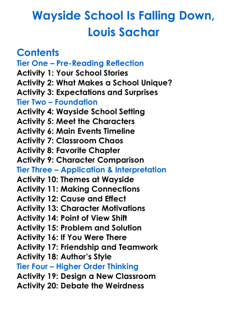Wayside School Is Falling Down Louis Sachar Worksheet Activity Booklet
