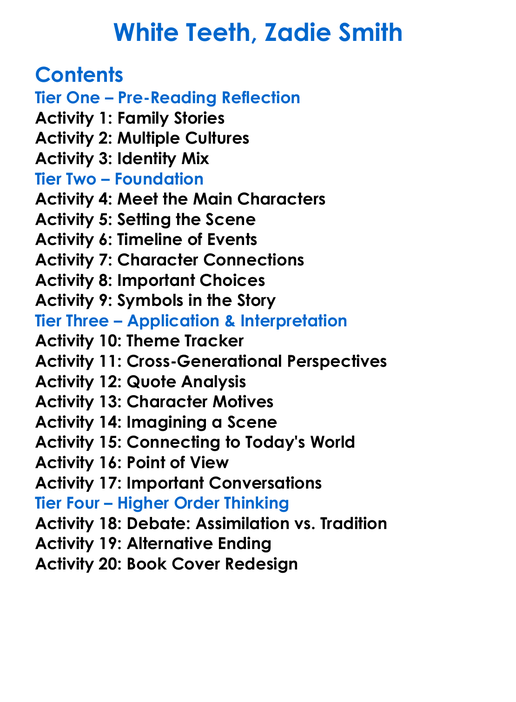 White Teeth Zadie Smith Worksheet Activity Booklet