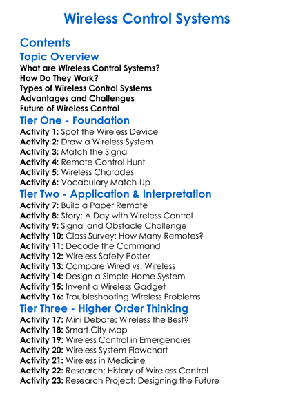 Wireless Control Systems Worksheet Activity Booklet