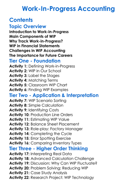 Work-In-Progress Accounting Worksheet Activity Booklet