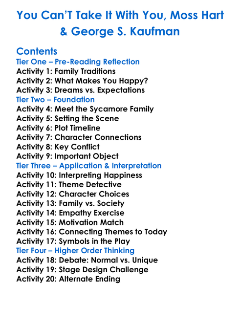 You Cant Take It With You Moss Hart George S Kaufman Worksheet Activity Booklet