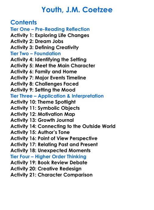 Youth Jm Coetzee Worksheet Activity Booklet