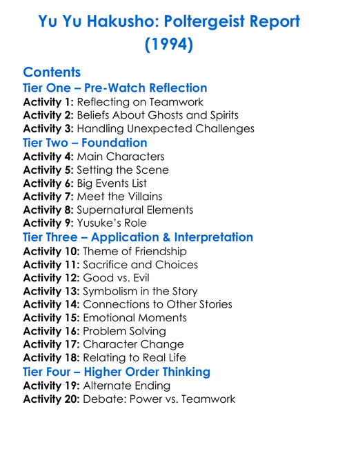Yu Yu Hakusho Poltergeist Report 1994 Worksheet Activity Booklet