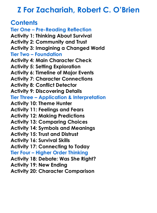 Z For Zachariah Robert C Obrien Worksheet Activity Booklet